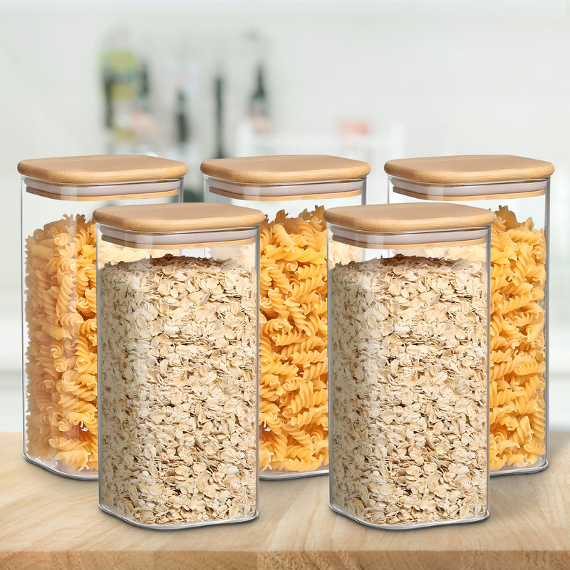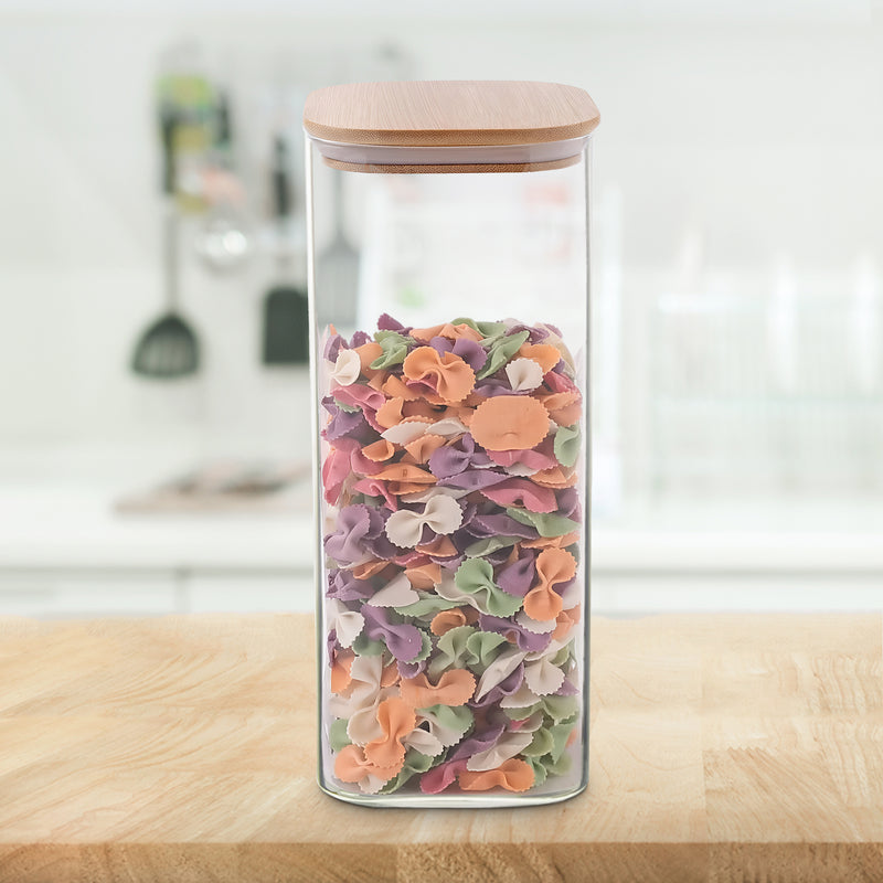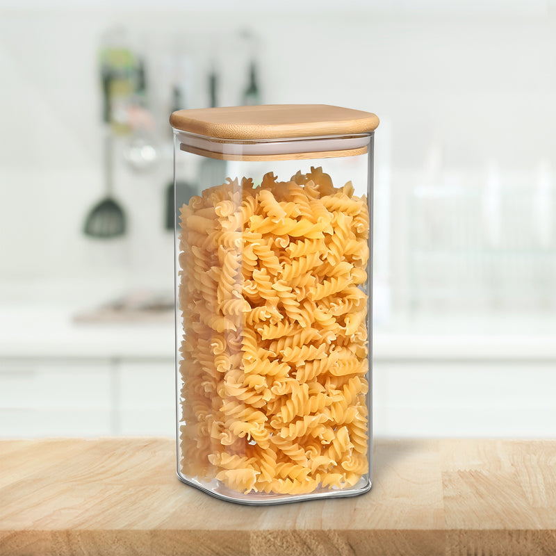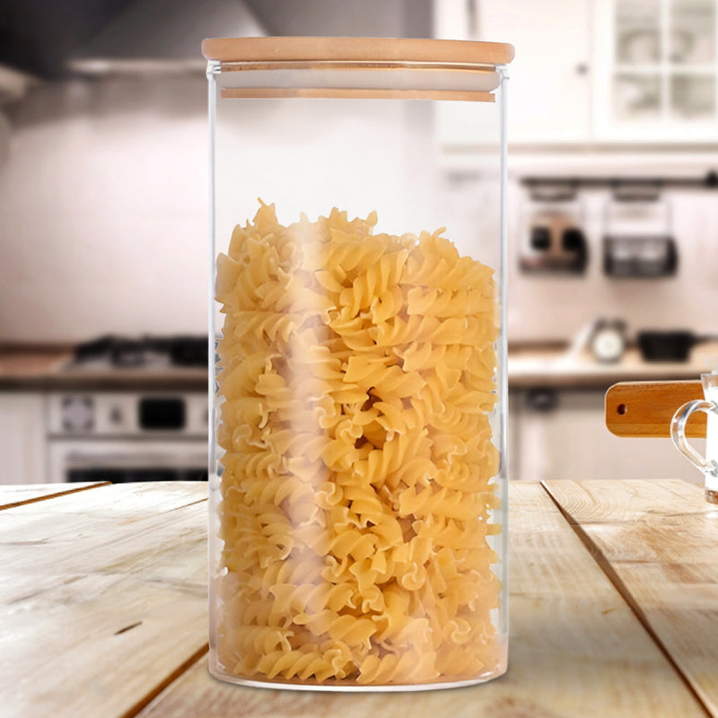 The kitchen containers set glass is made from foodsafe and eco friendly materials. It is easy to clean, as the glass storage jar is dishwasher safe, and the bamboo lid can be wiped with a cloth. This airtight glass container for kitchen storage keeps food fresh and safe. If you are looking for a glass storage jar, airtight container set, borosilicate containers with lid, small glass jars with lid, or a stylish kitchen glass containers set, this jar is a great choice.